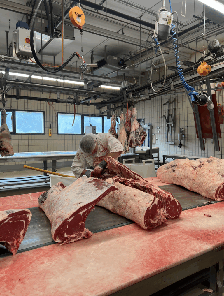 Ca. 500 Schweine, 100 Grossvieh und 100 Kälber werden wöchentlich geschlachtet, grösstenteils verarbeitet oder in grossen Stücken verkauft. Die modern eingerichtete Zerlegerei ermöglicht uns effizient Schweine zu zerlegen.